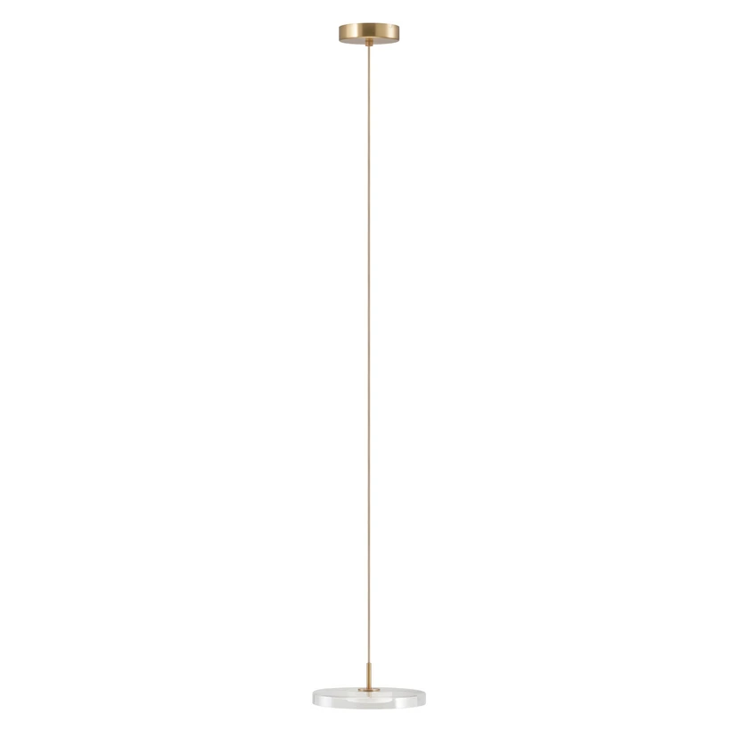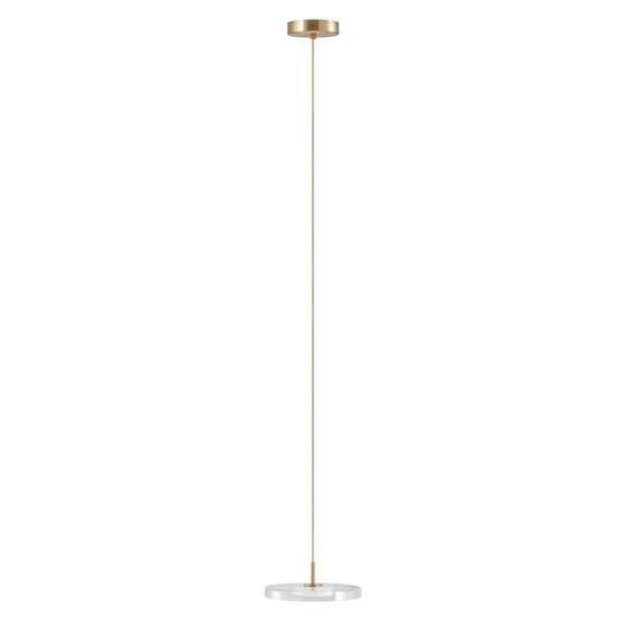UMAGE LED viseća svjetiljka Asteria Mini kombinira minimalistički dizajn s funkcionalnom rasvjetom. Izrađena od visokokvalitetnog stakla i čelika, impresionira svojim čistim linijama i elegantnom kombinacijom prozirnih i mesinganih elemenata. Integrirani LED izvor svjetla pruža ravnomjerno osvjetljenje i ugodnu toplu bijelu boju svjetla od 2700 K, stvarajući ugodnu atmosferu. S izvrsnim indeksom reprodukcije boja od 90 Ra, boje se prikazuju posebno prirodno i živopisno.