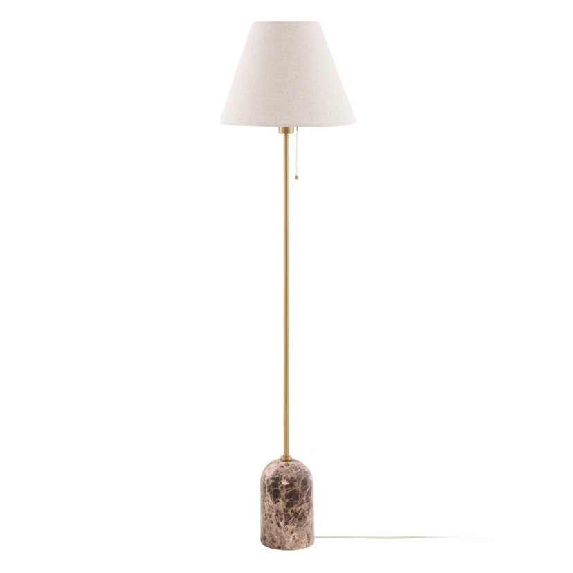 Podna lampa Gino tvrtke Globen Lighting kombinira bezvremenski dizajn s visokokvalitetnim materijalima. Elegantno mramorno postolje sa smeđim mramornim završetkom pruža savršenu osnovu za bež laneno sjenilo, koje osigurava skladnu raspodjelu svjetlosti. Kombinacija mramornih, lanenih i mesinganih akcenta daje lampi luksuzan, ali decentan izgled.