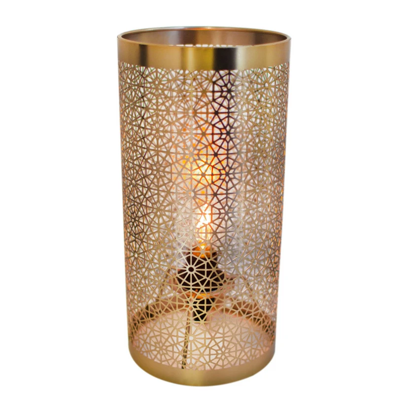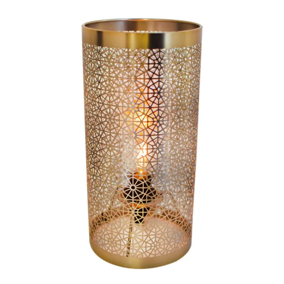 Stolna svjetiljka Hermine H28 cm mesing je atmosferska svjetiljka koja baca toplu, primamljivu svjetlost. Dizajn podsjeća na istočnjački dizajn—perforirani uzorak emitira difuzni sjaj na okolinu, stvarajući ugodnu atmosferu. Otvor na podnožju i vrhu abažura omogućuje izravno gore-dolje svjetlo, koje se reflektira u svijetlim površinama prostorije, što rezultira još jačim osvjetljenjem.